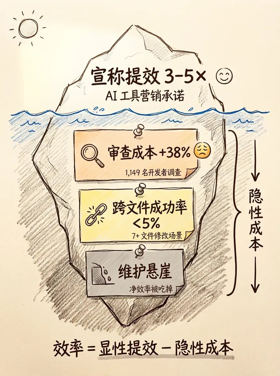 Pragmatic Engineer 的 Gergely Orosz 把这种现象叫做”速度提升的条件性”:AI 确实让简单任务变快了,但复杂任务的”快”是表面上的——你把审查、调试、修复 AI 留下的坑的时间算进去,净效率提升远没有宣传的那么高。