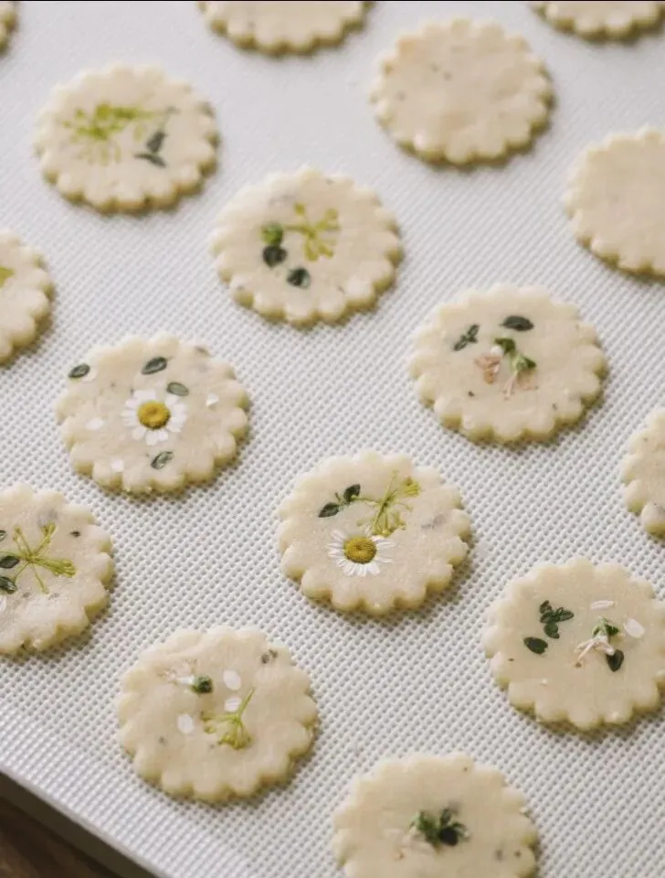 ❺ 垫油纸擀至5mm厚,放上可食用的小花花,再擀至4mm,用花边模具按压出图案