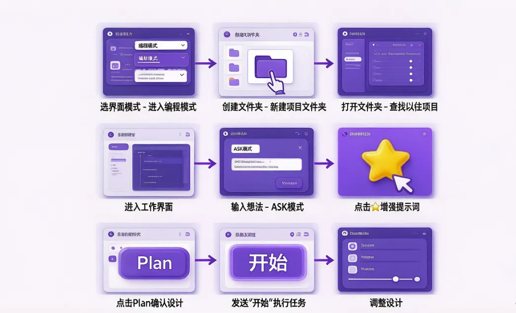 对话框右下角有个星星按钮,点击就可以优化你的提示词 - 点击”Plan”按钮,确认设计
