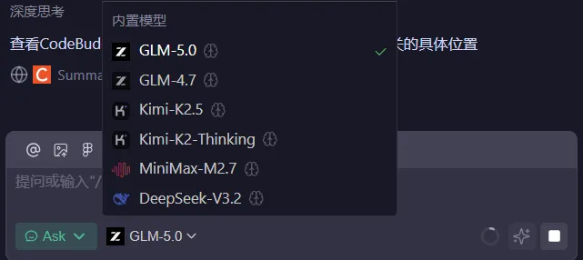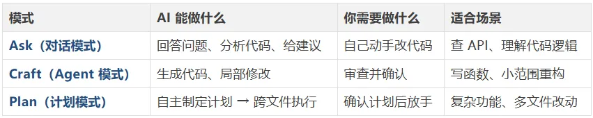 这是CodeBuddy IDE最核心的设计——根据AI控制权的不同,提供三种模式: