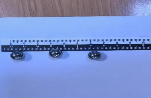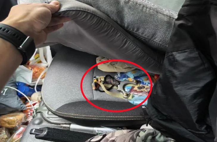 ▲在赵某驾驶车辆的副驾驶车垫下查获的弹弓和未使用的钢珠