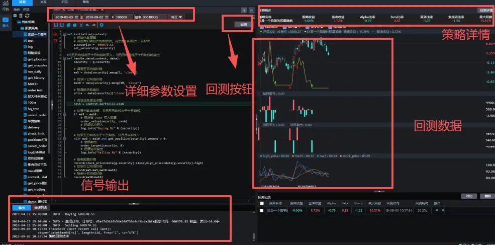 回测之前需要对开始时间、结束时间、回测资金、回测基准、回测频率几个要素进行设定,设定完毕后点击保存。 然后再点击回测按键,系统就会开始运行回测,回测的评价指标、收益曲线、日志都会在界面中展现。