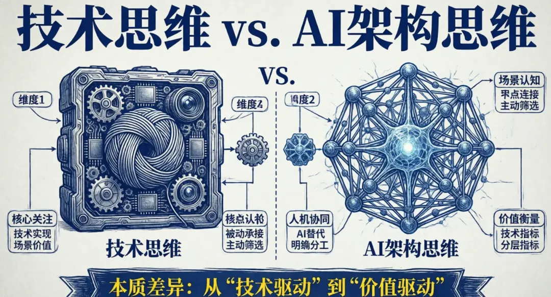 随着 “人工智能 +” 战略向产业纵深推进,AI发展已进入架构能力竞争的下半场,技术不再是核心卡点,“架构智能的能力” 成为产业落地关键。传统软件信息服务公司作为连接AI技术与产业场景的核心枢纽,其核心人才,比如技术骨干、项目经理等普遍存在 “技术思维依赖”,聚焦技术实现而忽视场景价值与业务闭环,难以适配AI原生企业转型需求等问题。本研究结合《“人工智能+”:开启产业智能原生新时代》长江商学院终身教授孙天澍的核心观点,通过分析 “技术思维” 与 “AI 架构思维” 的本质差异,拆解AI架构思维的核心能力维度,提出 “认知重塑—能力锻造—实践赋能”的三步转型路径及配套保障措施,助力企业在AI时代构建核心竞争力。