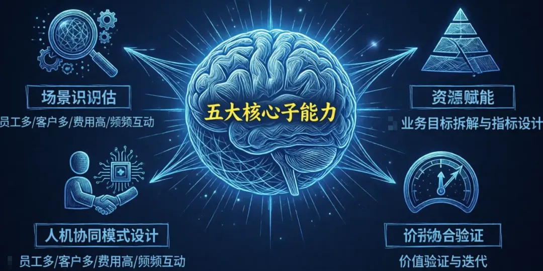 AI架构能力是AI架构思维的具象化体现,是软件信息服务企业人才在 “人工智能+” 场景下,AI智能体与业务场景深度融合、创造业务价值的核心能力集合。围绕软件信息服务行业特性与AI产业需求,拆解为五大核心子能力。
