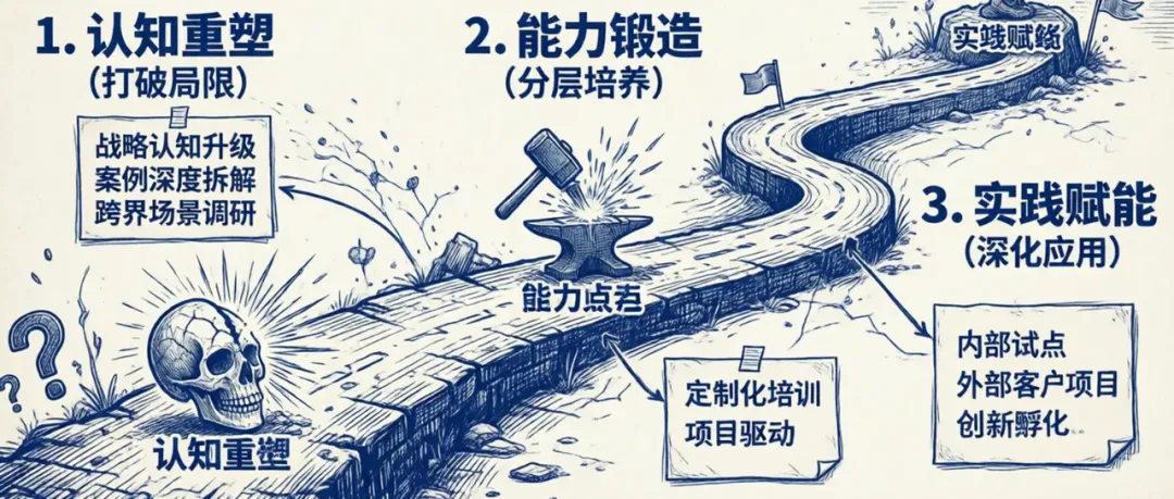 战略认知升级:邀请AI领域学者、产业落地专家开展专题培训,解读 “人工智能 +” 战略与AI下半场产业趋势,重点传递 “AI从工具到智能内核” 的本质转变,帮助内部人员理解AI架构思维的核心价值。