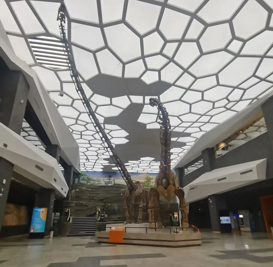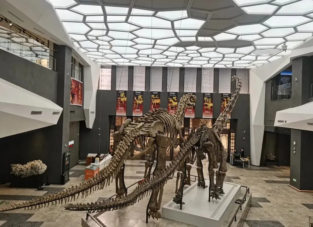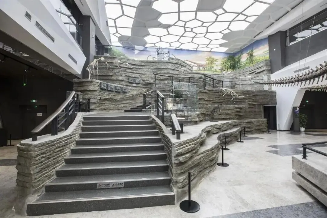 展厅通道地面深色反光,两侧地质剖面图引导视线。梁龙骨架并排陈列,头颈伸向天花板,顶部的蜂窝状吊顶是现代设计与原始气息的生动结合。长颈恐龙骨架斜置,橙色展台突出其姿态。巨型蜥脚类恐龙骨架垂直悬吊,头朝上,尾部垂落。这些原始化石或模型都通过一定的设计将其面貌更加真实地呈现了出来。