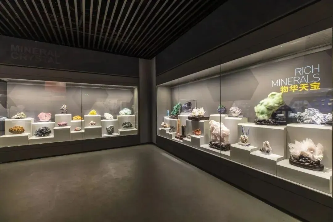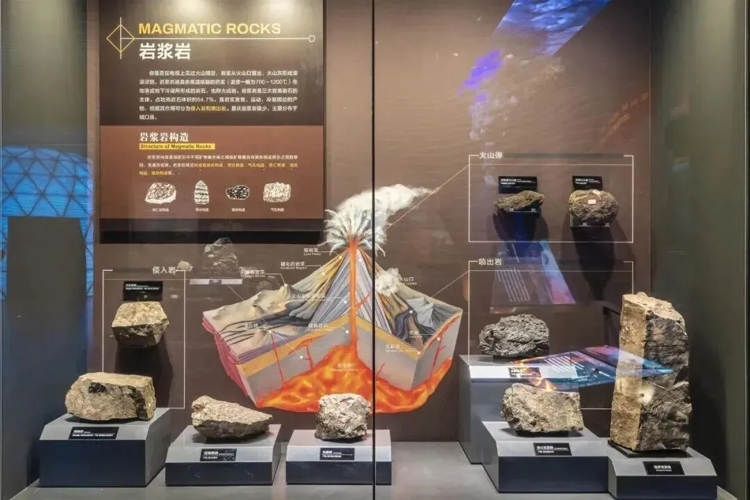 地质厅以沉积岩地层为原型设计缓坡道,你顺着往下走,脚下是寒武纪到新生代的岩层切片,灰白、赭红、墨绿层层叠压。展柜里则展示因沉积作用、地质运动、火山爆发而着形成的各种岩石,这是对地质构成的详细解释。