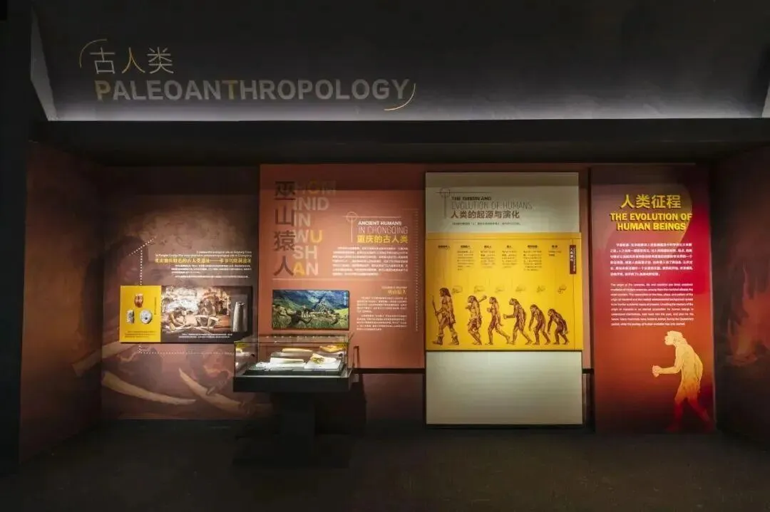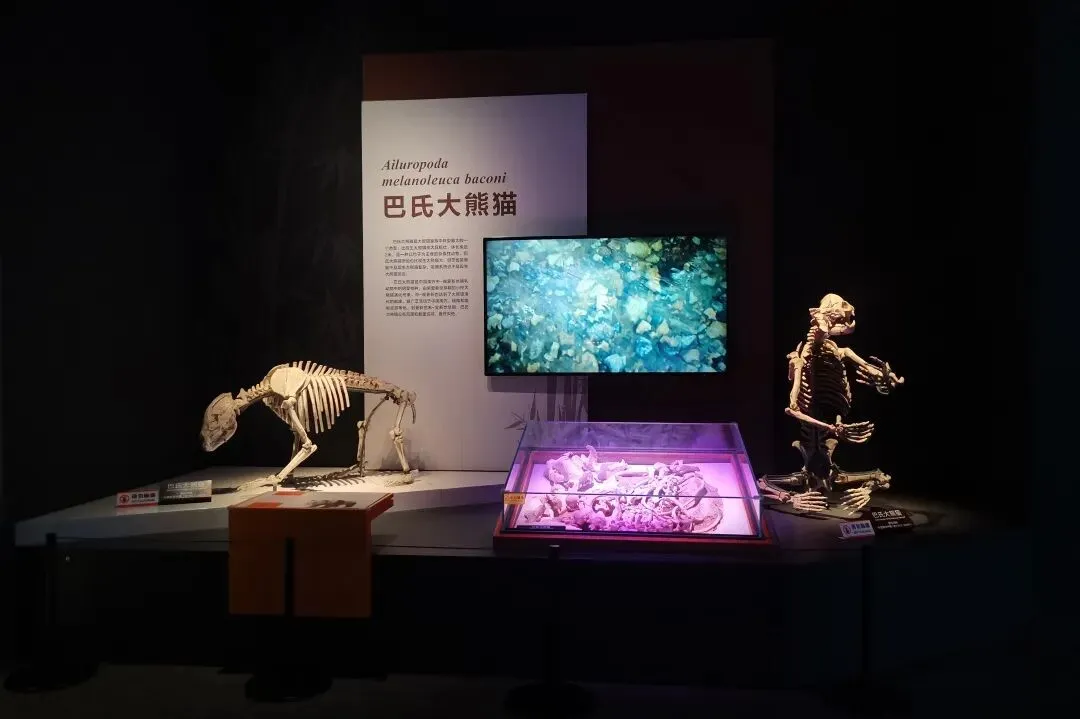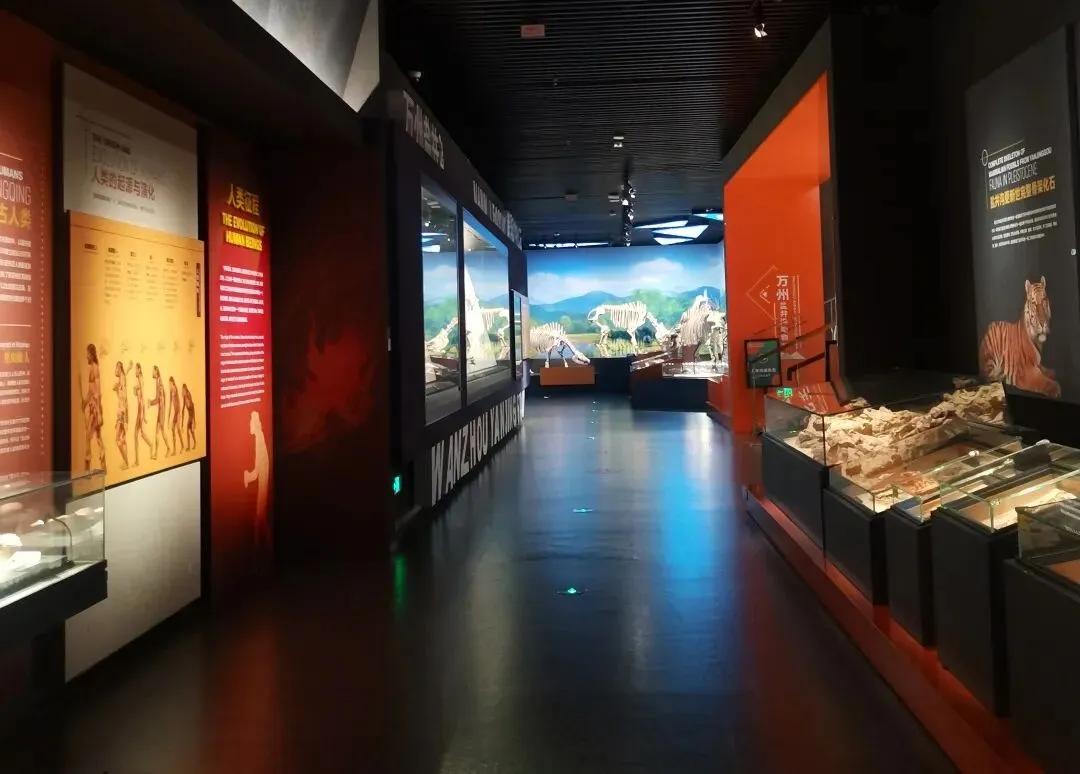 生命厅聚焦本土明星:巴氏大熊猫骨架低伏展台,头骨旁标注“颧骨比现代种更粗壮”;巫山猿人区则通过展板与展柜的结合介绍着他们的生活、文化习惯。