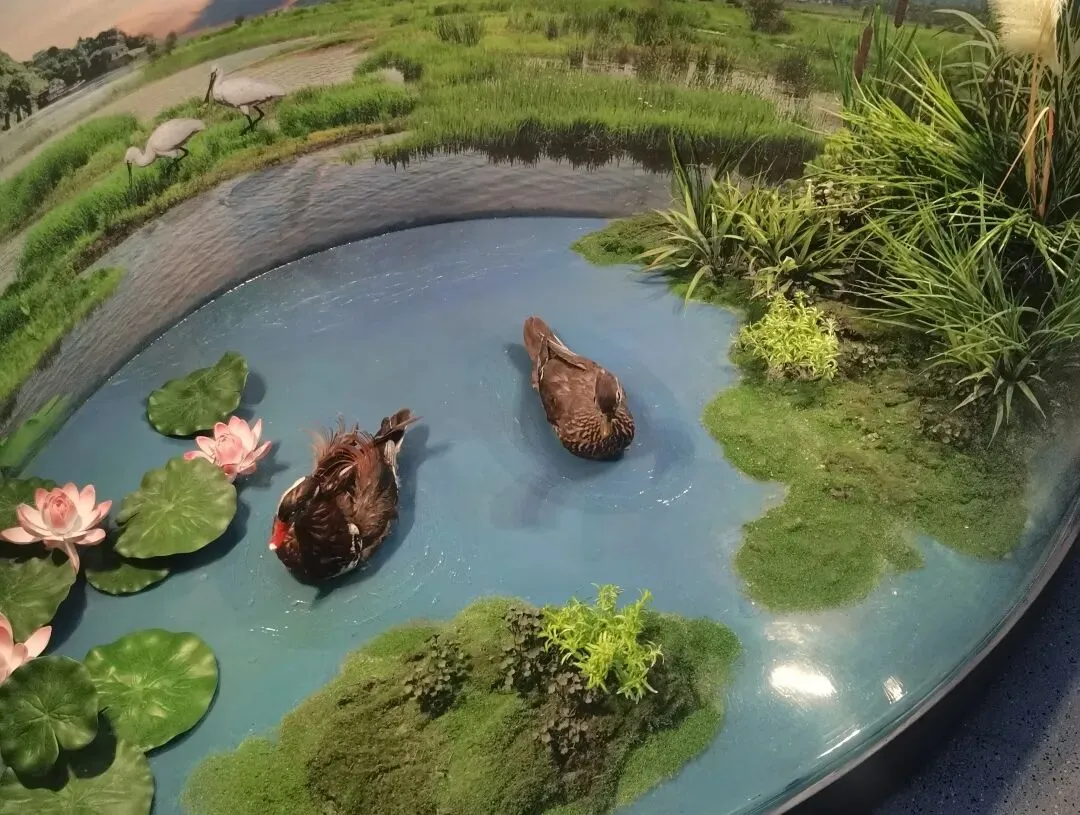 展厅的坡道表面做了微糙防滑处理,脚踩有真实踏勘感。展柜统一低反射玻璃,你俯身时,脸与化石同框,倒影清晰。巴氏大熊猫展台用顶部聚光灯聚焦关键特征。水生生物展区水箱透明,鱼类模型在漂浮水中的植物间游弋。鸭子模型周围装饰着仿真绿植与芦苇并搭配着背景浅蓝的天幕,直观地展示着重庆地区独特的自然风貌。