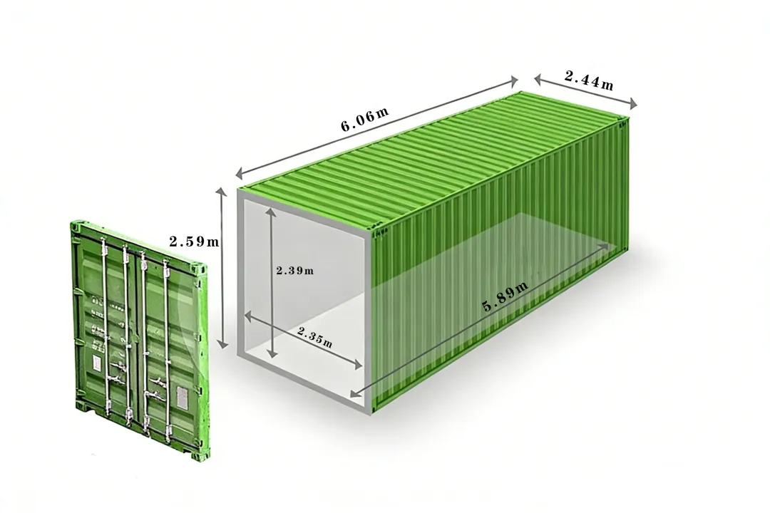 20英尺柜(小柜/20GP):外部尺寸长6.06m、宽2.44m、高2.59m;内部长约5.89m,宽2.35m,高2.39m,容积约28方,载重上限约28吨,堪称“性价比之王”,适合重货、小批量货物运输,也是码头堆存、短途运输的常用款。