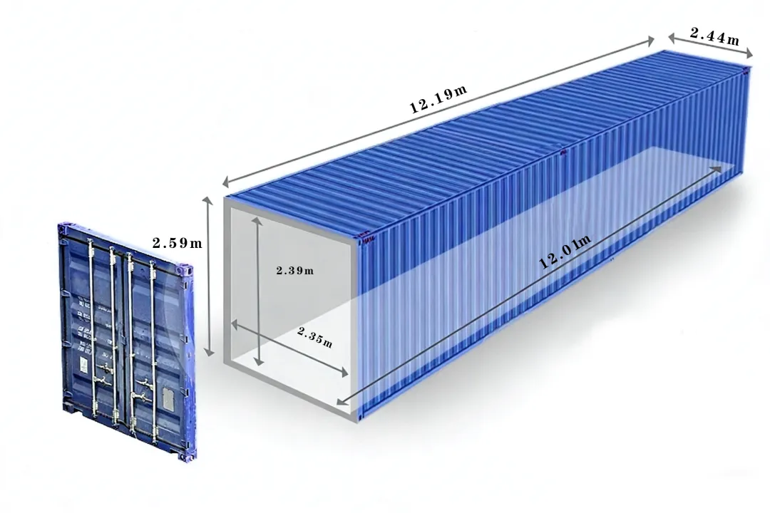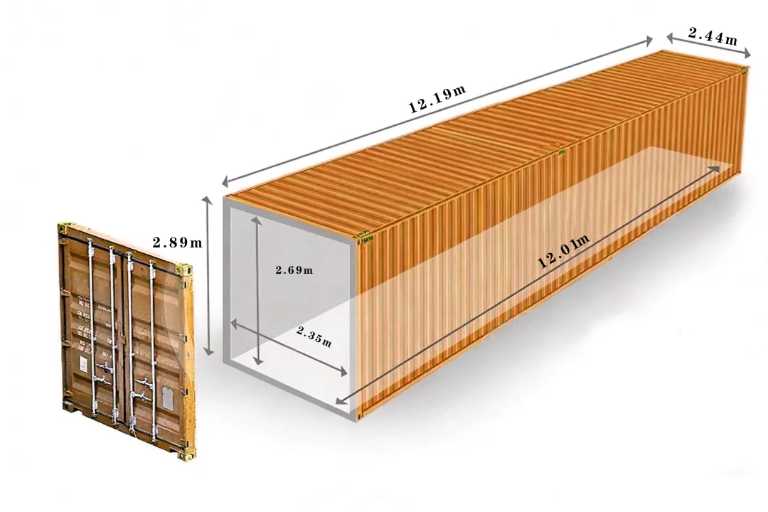 40英尺高柜(加高柜/40HQ/HC):外部尺寸长12.19m、宽2.44m、高2.89m;内部长约12.01m,宽2.35m,高2.69m,容积约76方,载重和40GP接近,专门拉轻泡货,空间利用率拉满,适合服装、家具、电商包裹等体积大、重量轻的货物。