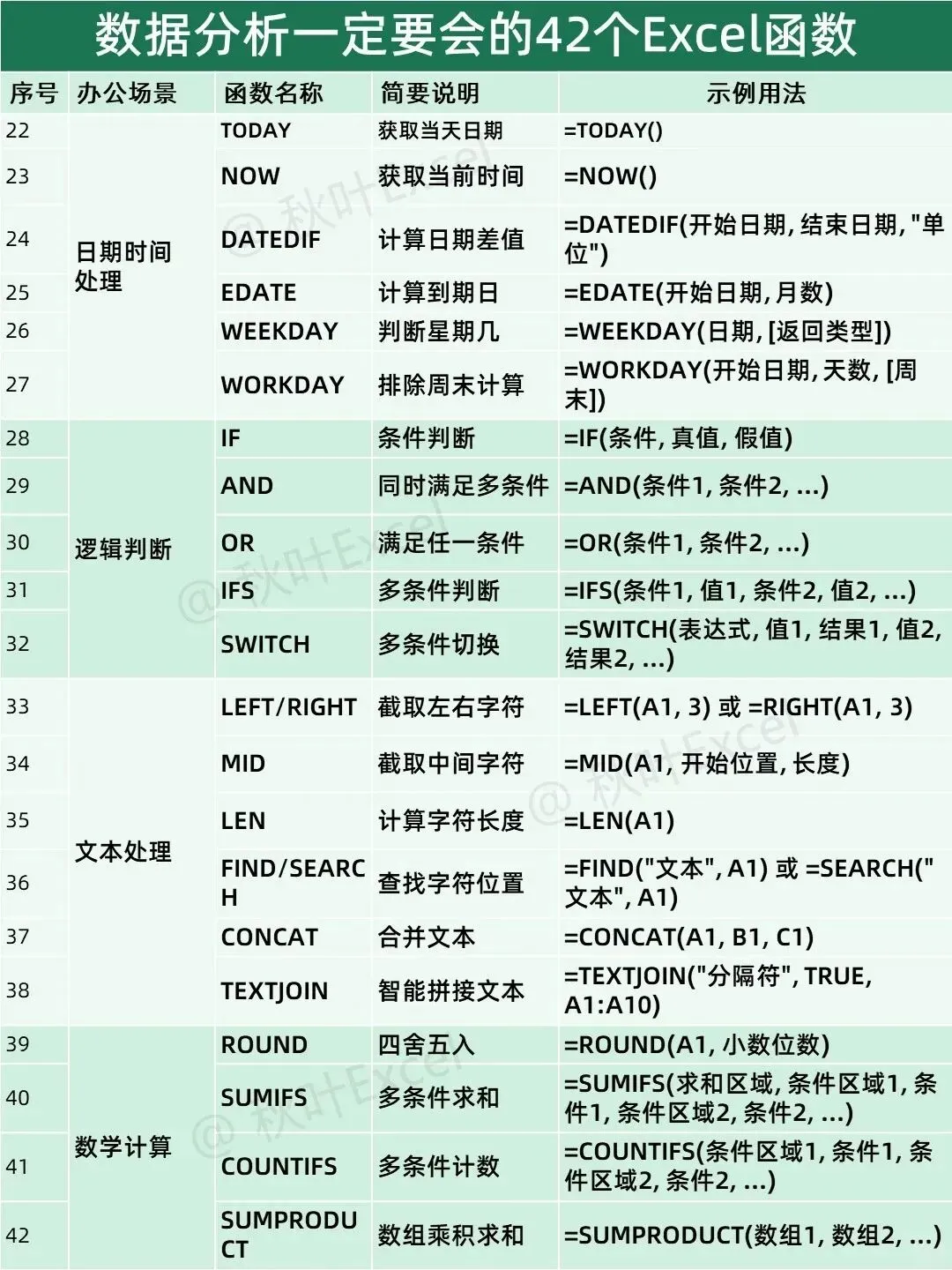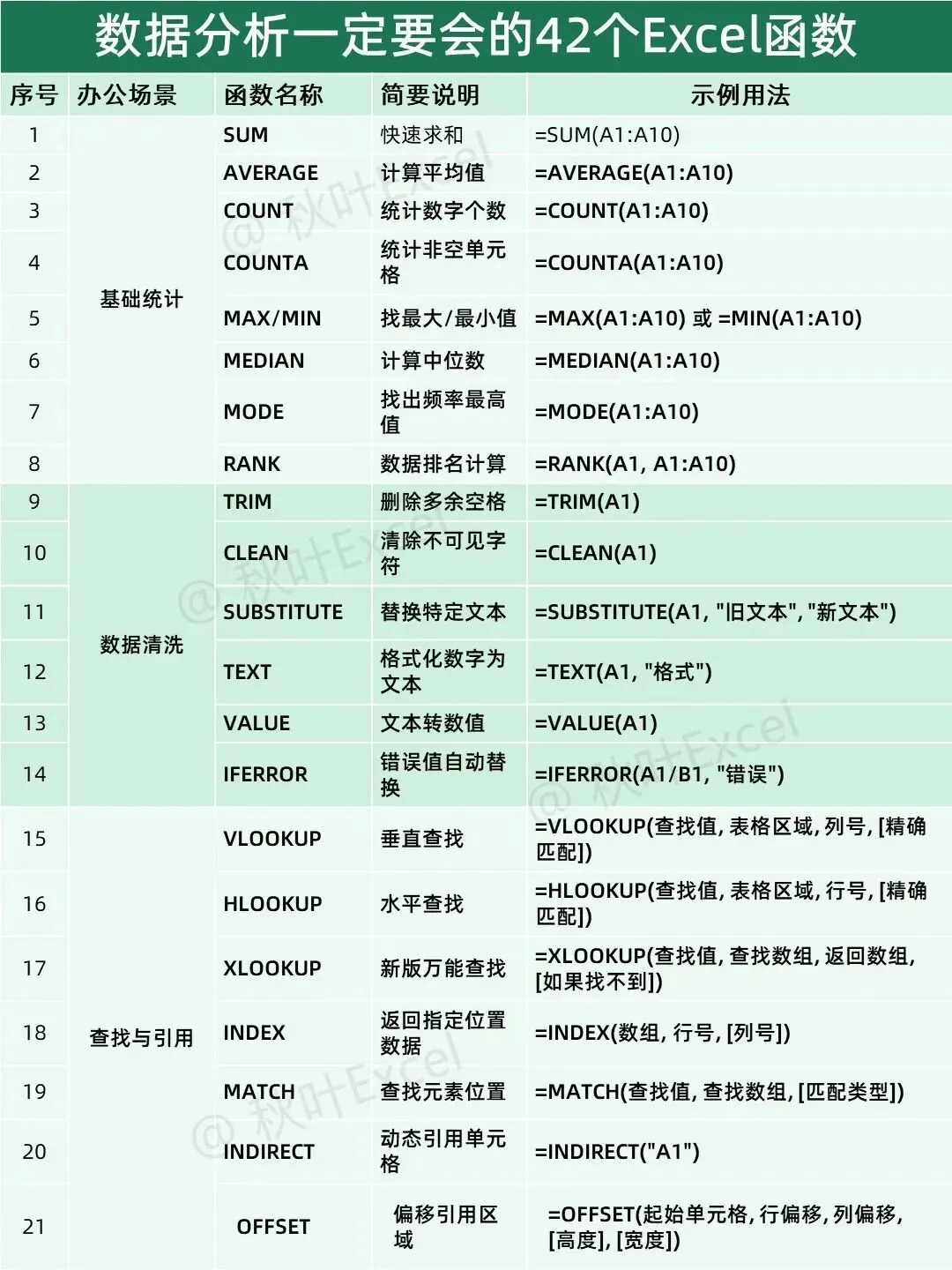 Excel是职场人最常用的数据处理工具,而函数则是Excel的灵魂。无论你是数据小白还是资深分析专家,掌握核心函数都能让你的工作效率翻倍。今天,我们整理了数据分析必备的42个Excel函数,覆盖求和统计、查找引用、逻辑判断、文本处理、日期时间等七大场景,一文帮你打通任督二脉!