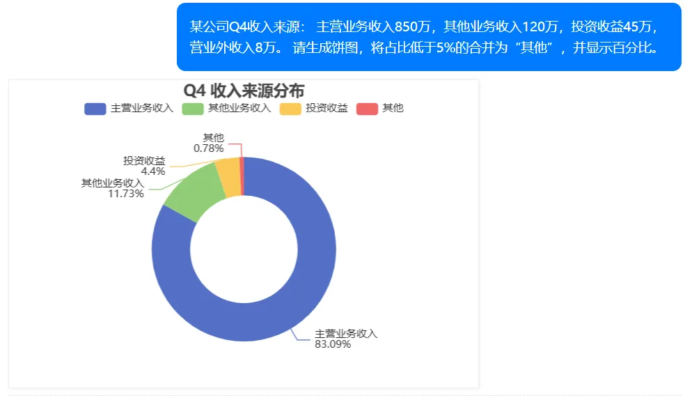某公司Q4收入来源: 主营业务收入850万,其他业务收入120万,投资收益45万,营业外收入8万。 请生成饼图,将占比低于5%的合并为“其他”,并显示百分比。