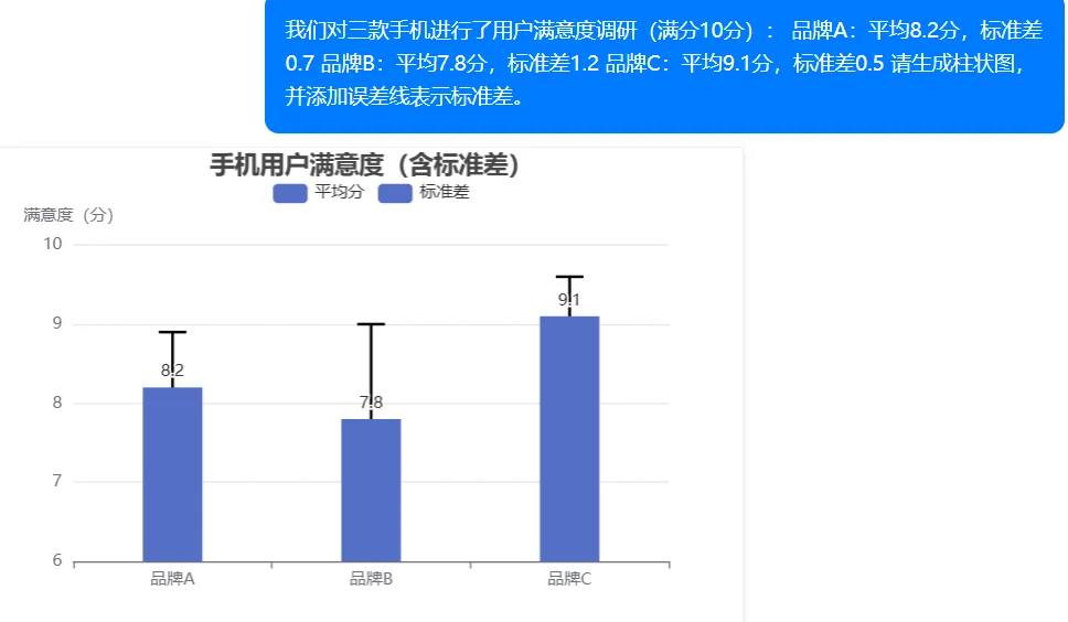 自动识别“平均分”和“标准差”,生成柱状图并添加误差线(误差范围±标准差),柱顶显示平均分值,清晰展示三款手机的满意度和波动情况。