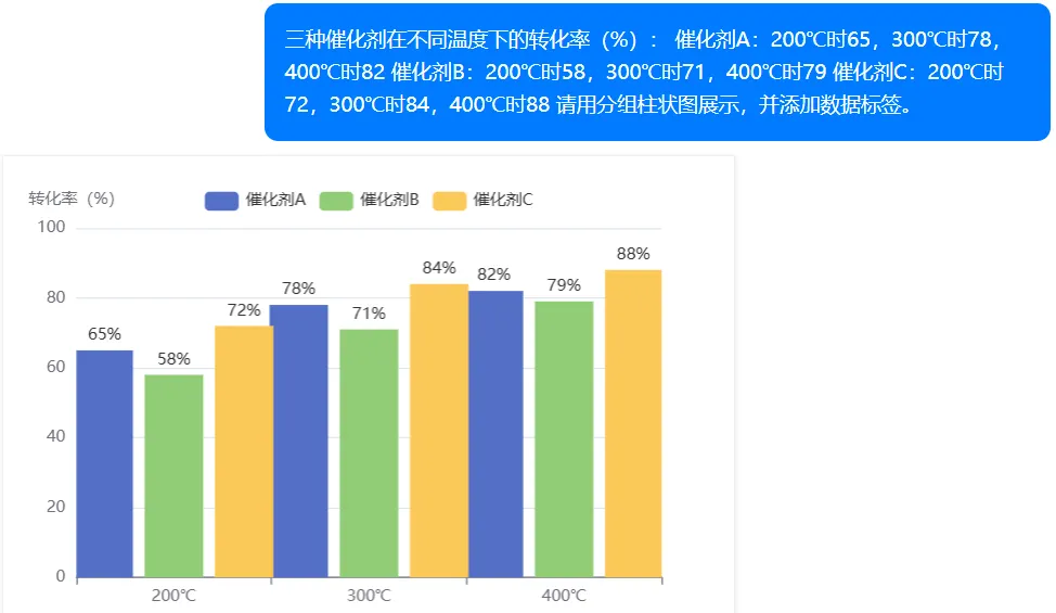识别出三个系列(催化剂)和三个类别(温度),自动生成分组柱状图,不同催化剂用不同颜色区分,柱顶显示数值,方便对比。