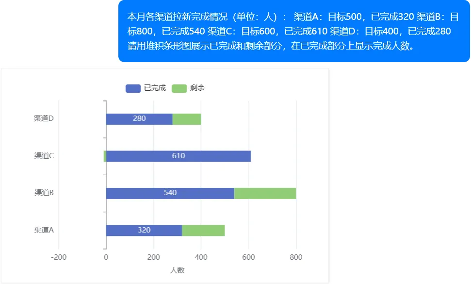本月各渠道拉新完成情况(单位:人): 渠道A:目标500,已完成320 渠道B:目标800,已完成540 渠道C:目标600,已完成610 渠道D:目标400,已完成280 请用堆积条形图展示已完成和剩余部分,在已完成部分上显示完成人数。