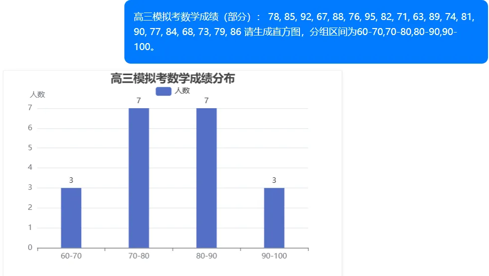 自动统计各分数段人数,生成直方图(柱状图),横轴为分数区间,纵轴为人数,并在柱顶显示频数,便于分析成绩分布。