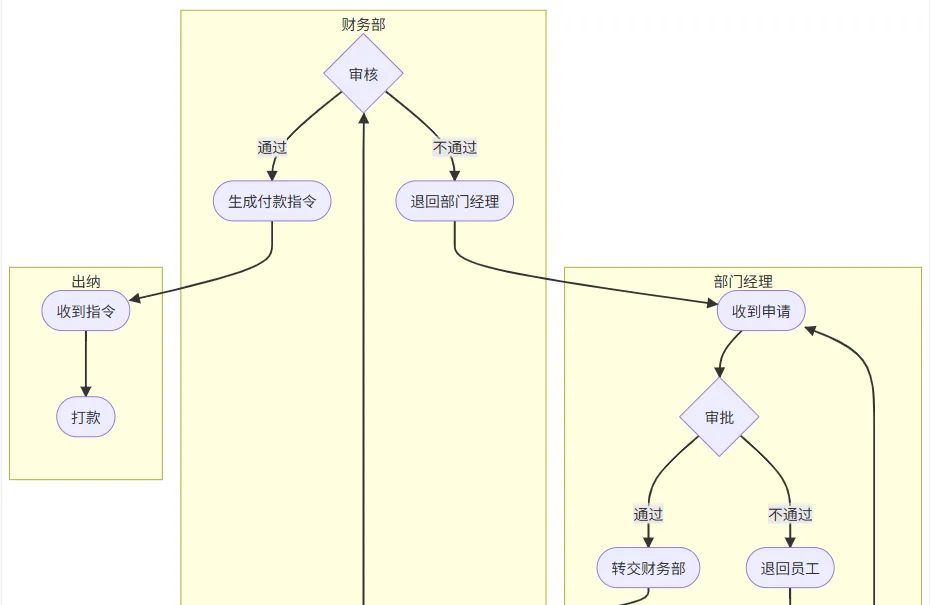自动解析不同角色(员工、部门经理、财务部、出纳),生成泳道图,各步骤放在对应泳道中,分支流程用条件判断表示,清晰展示跨部门协作。