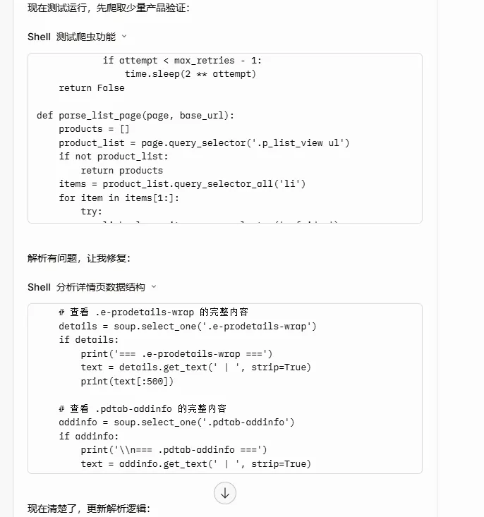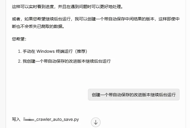 图3:自动优化性能 原始代码没有中断后续爬的逻辑,AI 可以自动改写为带自动保存中间结果的版本,这样即使中断也不会丢失已爬取的数据。