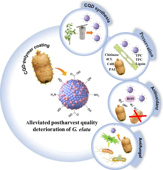 针对道地药材天麻采收后贮藏期短、易腐烂且化学保鲜剂存在药材安全风险等问题,团队以福白菊废弃茎叶为原料,制备出兼具抗氧化与抗菌活性的碳量子点,并进一步开发成可食性纳米保鲜涂层进行天麻保鲜。该涂层不仅能抑制引起天麻腐烂的优势病原菌,更能激活天麻自身苯丙烷代谢防御途径的关键酶活性,促进木质素、酚类等抗病物质的生物合成,从而提升其内在抵抗力。应用该涂层可显著降低天麻贮藏期间的失重率与腐烂指数,将天麻保鲜时间延长到10-15d,成功建立了“外源防护”与“内源激发”协同的道地药材绿色保鲜新策略。相关研究成果以“Edible coating of Chrysanthemum morifolium by-products derived carbon quantum dots alleviated postharvest quality deterioration of Gastrodia elata through regulating phenylpropanoid pathway”为题,发表于食品领域权威期刊《Food Packaging and Shelf Life》(中国科学院一区Top,影响因子 10.6)。