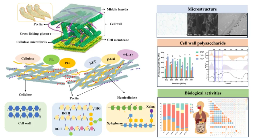 针对天麻干燥过程中能耗高、周期长、热敏性活性成分易被破坏等问题,团队创新引入了高静水压预处理技术,通过非热力处理的物理方式改变鲜天麻微观结构与细胞壁多糖组分,有效减小了天麻组织致密导致的干燥阻力。该技术预处理后,天麻的热风干燥时间缩短了32.6%,干燥后产品复水性得到显著改善,并有效保留了天麻的天麻素、巴利森苷等活性成分,提高了天麻药材的生物活性,为高值药材的绿色节能加工提供了新技术。相关研究成果以“Modification of the microstructure and cell wall polysaccharides alters drying behavior and biological activities of Gastrodia elata by high hydrostatic pressure pretreatment”为题,发表于食品领域权威期刊《Innovative Food Science and Emerging Technologies》(中国科学院一区Top,影响因子 6.8)。