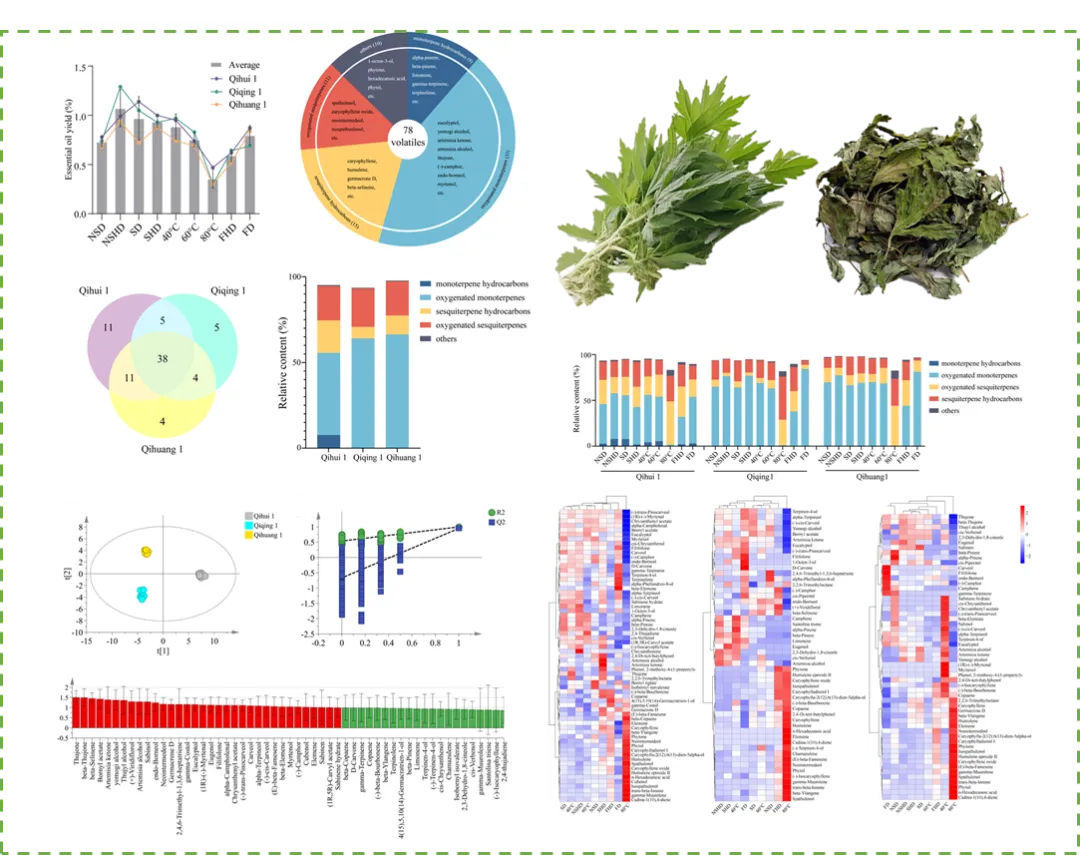 针对蕲艾传统干燥方法粗放、品质不一等问题,团队系统研究了晒干、阴干、热风干燥等九种干燥方式对三个艾叶品种(蕲艾1号、蕲青1号、蕲黄1号)中酚酸、黄酮及挥发油成分的影响。从多品种、多指标角度阐明了蕲艾干燥方式与活性成分保留的关联规律,明确了不同干燥方法的优缺点,为蕲艾叶干燥工艺的精准选择与参数优化提供了科技支撑。相关研究成果以“Effects of drying methods on phenolic acids, flavonoids, and essential oils in three cultivars of Artemisia Argyi”为题,发表于食品领域知名期刊《Food Chemistry: X》(中国科学院一区Top,影响因子8.2)。
