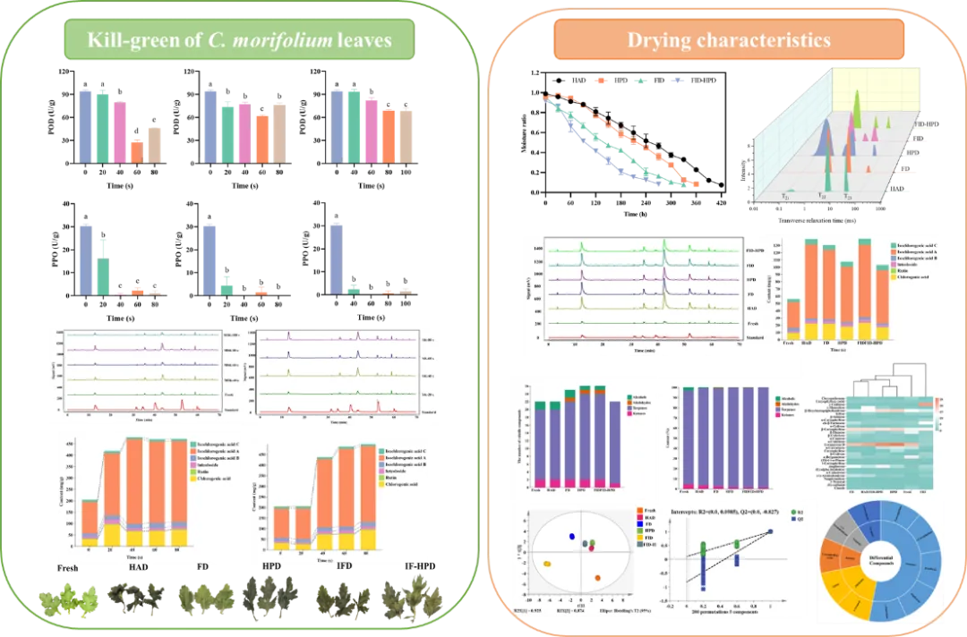 针对福白菊叶片干燥过程中易发生酶促褐变、活性成分降解且干燥能耗高等问题,团队系统研究了蒸汽杀青、热烫和微波杀青方式及其不同干燥方式对福白菊叶片品质的影响,建立了“蒸汽杀青-远红外热泵联合干燥”加工工艺。在蒸汽杀青高效钝化新鲜福白菊叶片相关酶活的基础上,利用远红外-热泵联合干燥技术显著缩短了干燥时间,最大程度保留了福白菊叶片中绿原酸等有效成分,促进了其特征性成分挥发性萜烯的积累,大幅提升了福白菊干燥叶片的抗氧化等生物活性。相关研究成果以“Effect of different kill-green and drying technology on the drying characteristics, bioactivities and volatile profile of Chrysanthemum morifolium leaves”为题,发表于农林领域知名期刊《Industrial Crops & Products》(中国科学院一区Top,影响因子 6.2)。