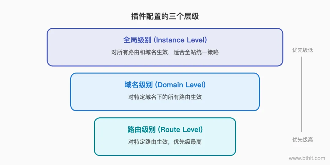 关键规则:路由级别 > 域名级别 > 全局级别。如果同一个插件在多个层级都有配置,细粒度的配置会覆盖粗粒度的。
