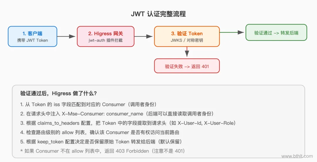 JWT(JSON Web Token)是目前最流行的无状态认证方案。Higress 的 jwt-auth 插件不只是验证 Token,还能识别调用者身份,支持不同调用者使用不同的 JWT 凭证。