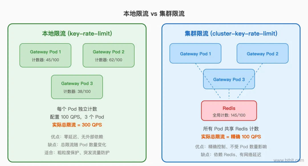 本地限流(key-rate-limit)是每个 Pod 独立计数的。如果你配了 100 QPS,跑了 3 个 Pod,实际总限流是 300 QPS。HPA 扩缩容时,总限流会跟着变。