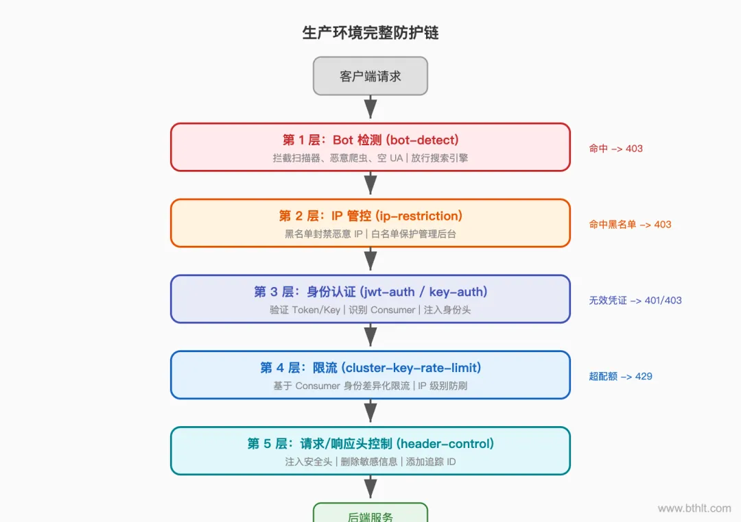 记住一个核心原则:先挡坏人(Bot 检测 + IP 管控),再验身份(鉴权),最后管流量(限流)。这个顺序不是随便定的,而是经过无数生产事故验证出来的最佳实践。