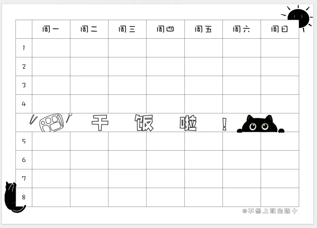 因为第一次做课程表,我没有想出太复杂的设计,却希望把家里的猫咪加进去,就在表中间和左下角画了两只猫。