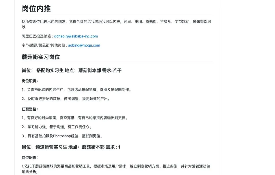 里面的招聘岗位更新了很多蘑菇街秋招的岗位,我们团队有个大数据岗位的空缺欢迎投递简历,也有阿里几个部门的内推信息,大家可以随时关注一下。