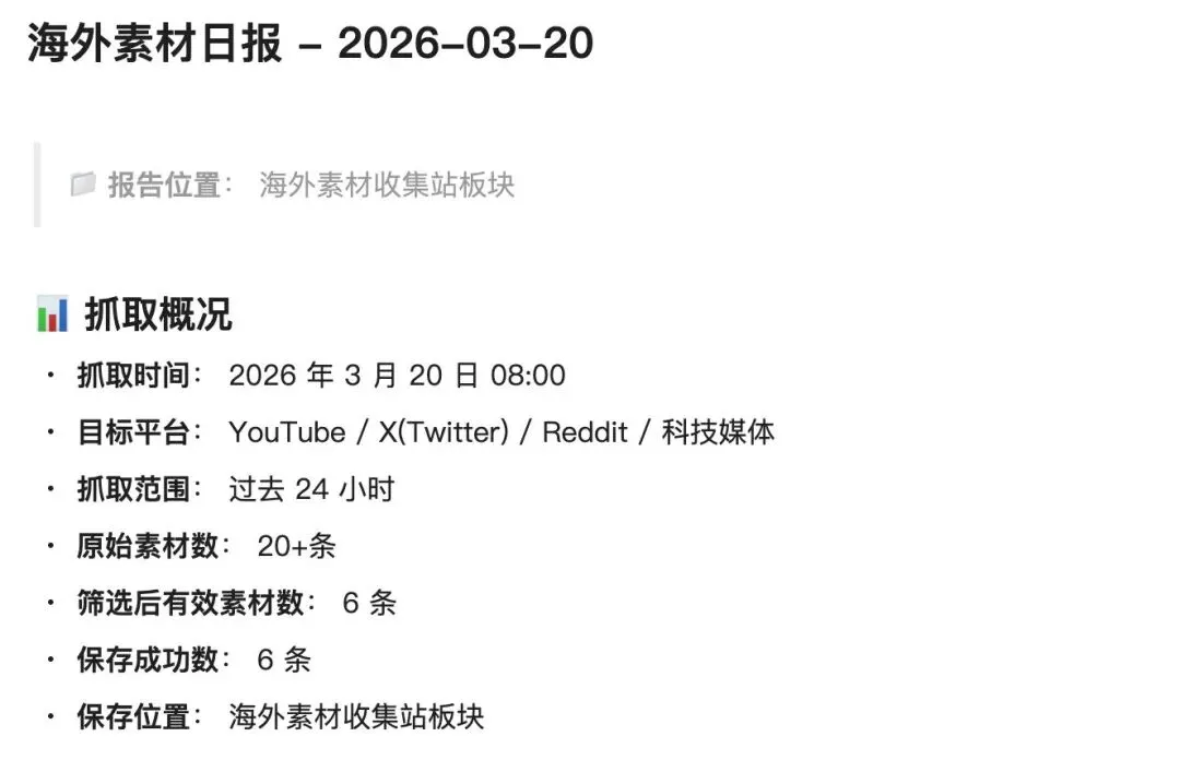 今天早上,照例打开我的“海外素材每日猎手”——这是我专门给自己做的一个 AI 技能,每天自动帮我从 YouTube、X、Reddit 等平台抓取 AI 和内容创作相关的优质素材。