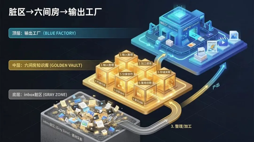我在直播里讲了一个概念:脏区(inbox)→六间房→输出工厂。