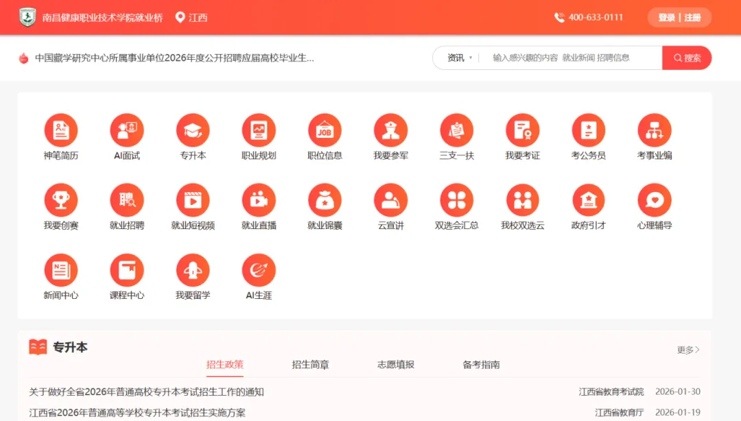 从就业资讯、职位信息到专升本、职业生涯规划、考证、双选云平台、就业培训到创赛、心理咨询等全模块覆盖,一站式解决求职升学难题,为你的未来保驾护航!