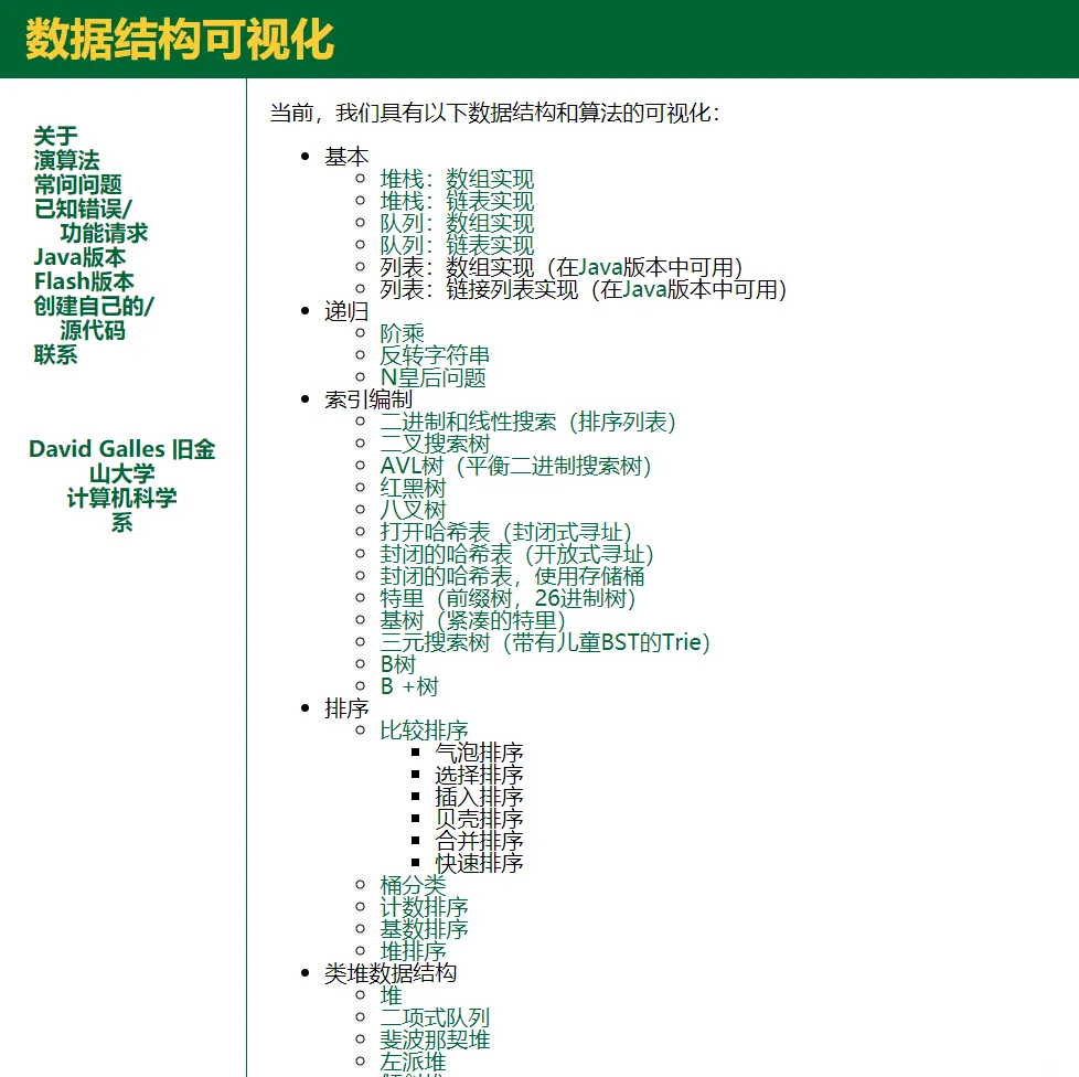 这是旧金山大学(USFCA)的一个网站,该网站以可视化的交互模式介绍数据结构和算法,非常有利于理解!