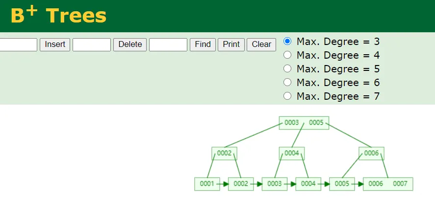 如果你想了解一下 B+ 树的动态插入过程,你可以手工插入节点,工具会一步步演示插入的过程,这里不方便贴动图,你可以自行尝试一下: