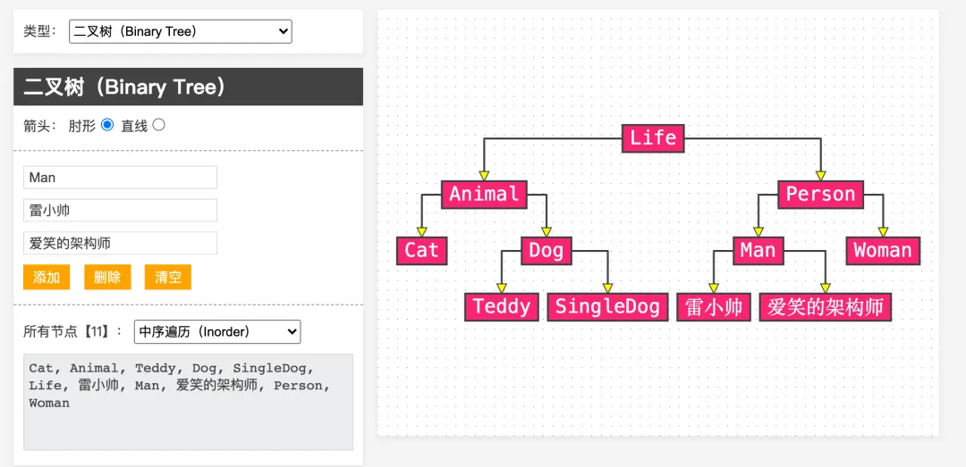 可以模拟树节点的添加和删除,也可以实时打印树的遍历结果,非常方便和直观。