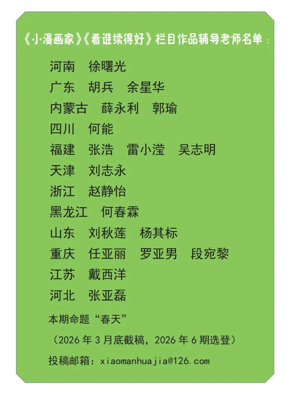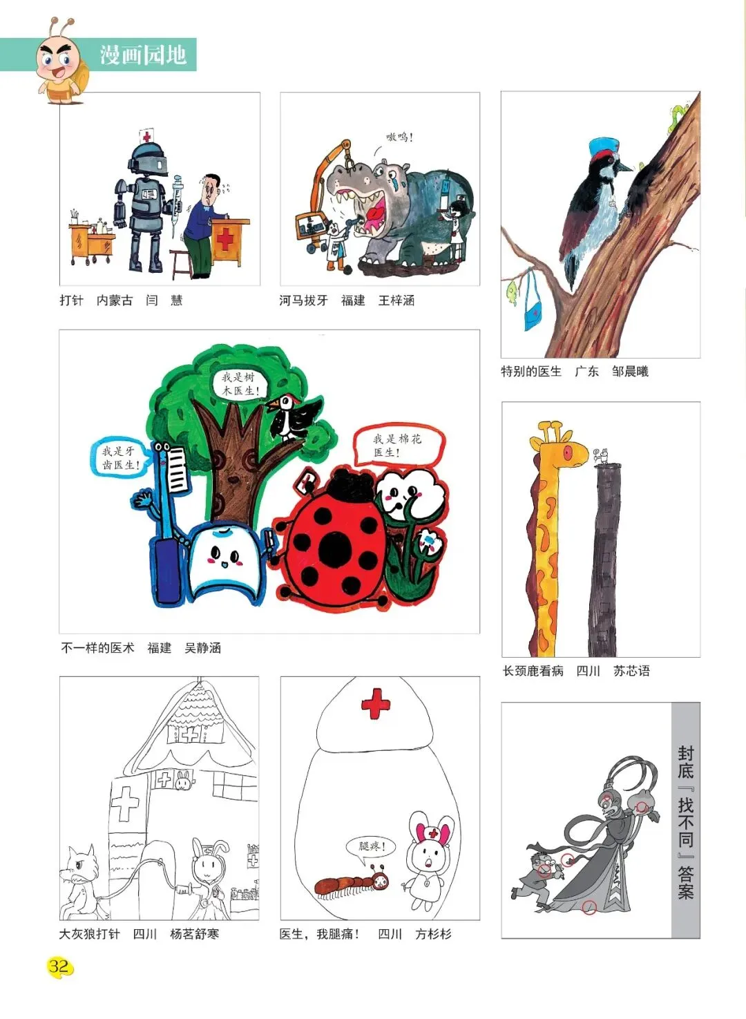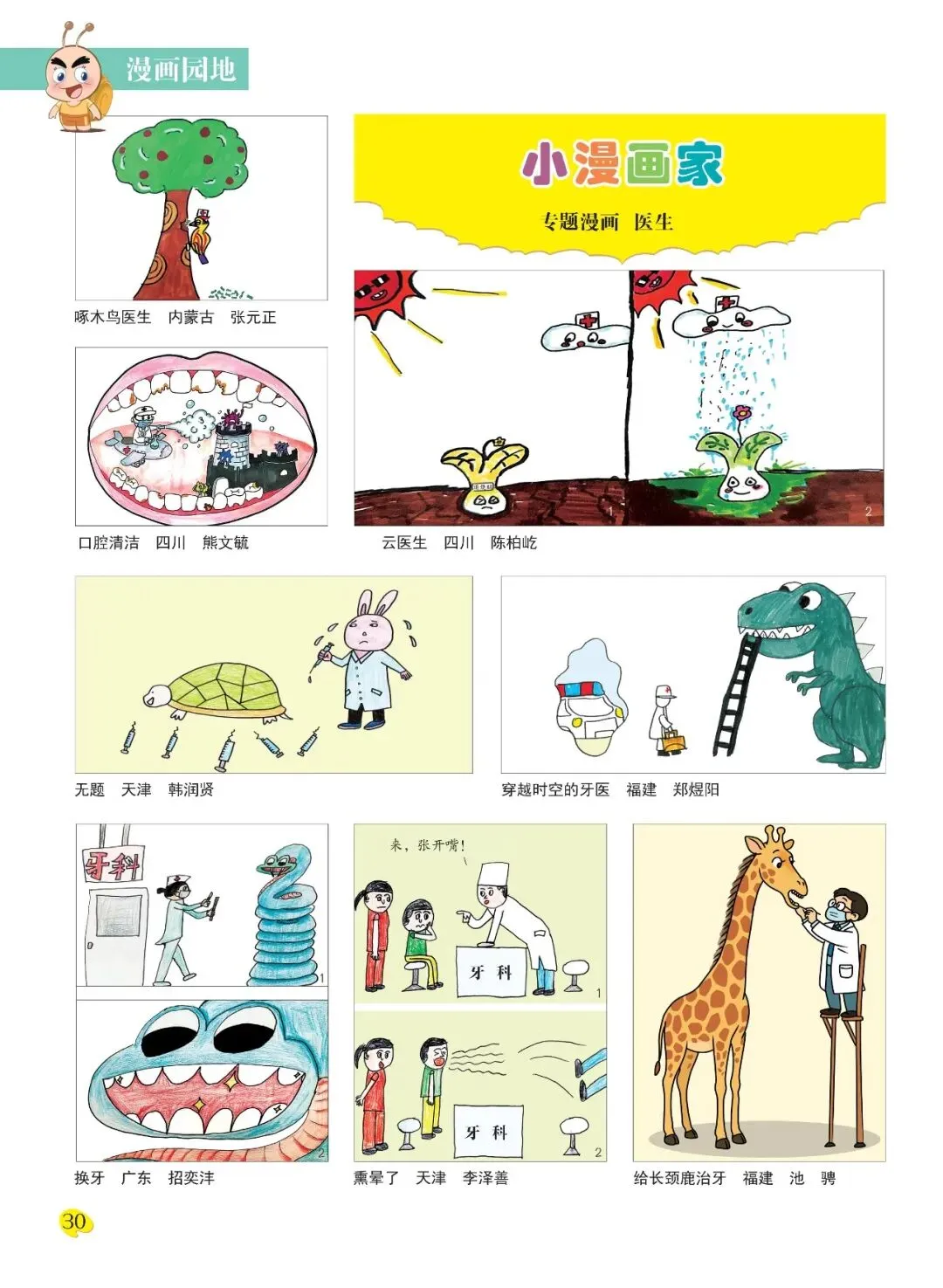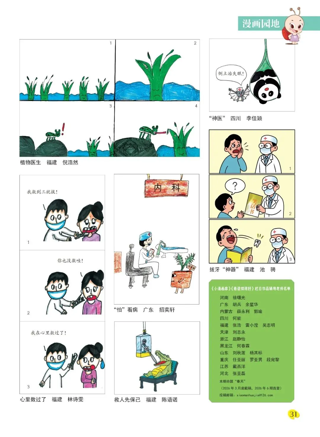 “小漫画家”栏目每月提供命题,孩子们根据命题进行创作、投稿。2月展示的专题是“医生”,这个专题是2025年12月份创作的。