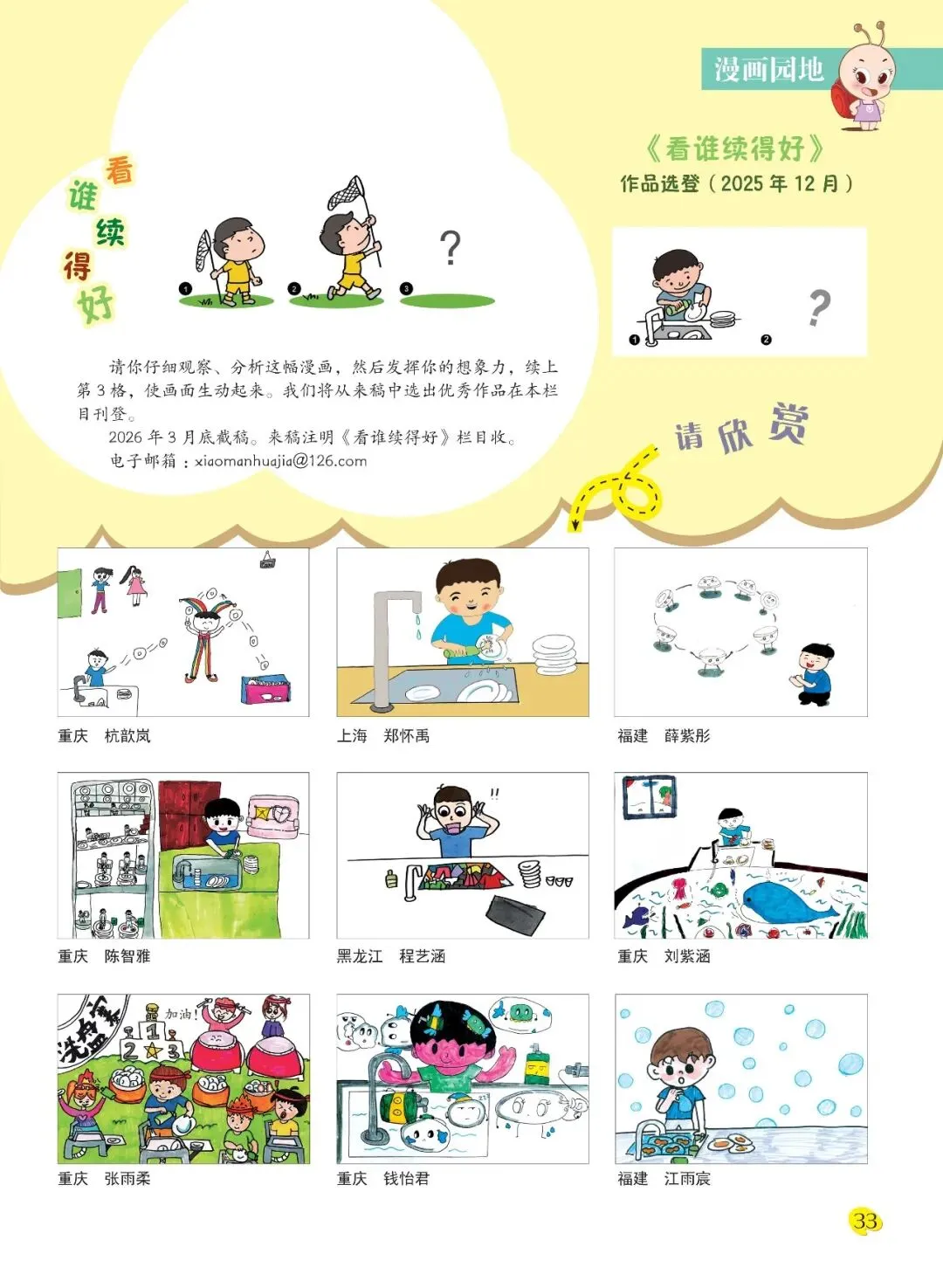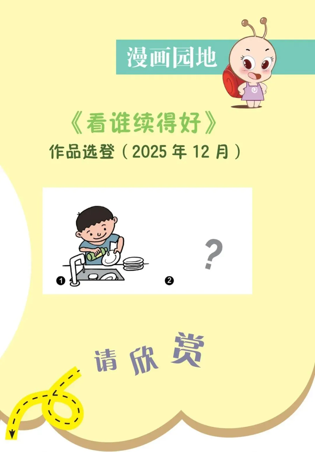“看谁续得好”栏目是根据前面提供的画面,让孩子们发挥想象力,接着构思并绘制结局,要求构思别出心裁,让人耳目一新。
