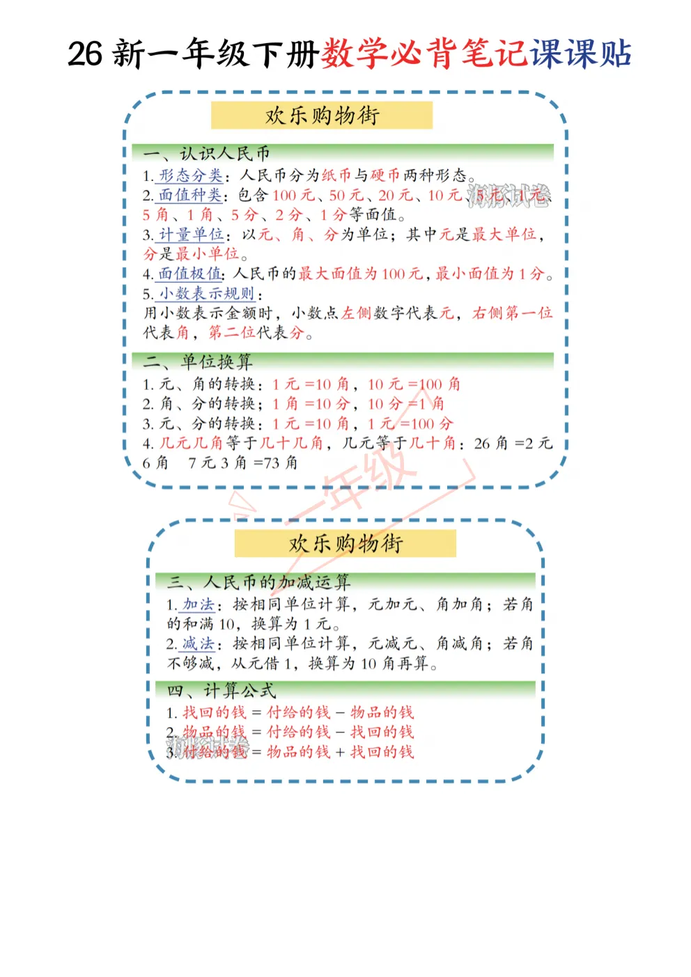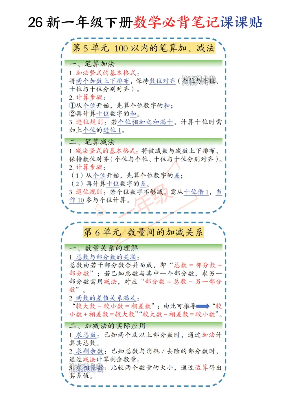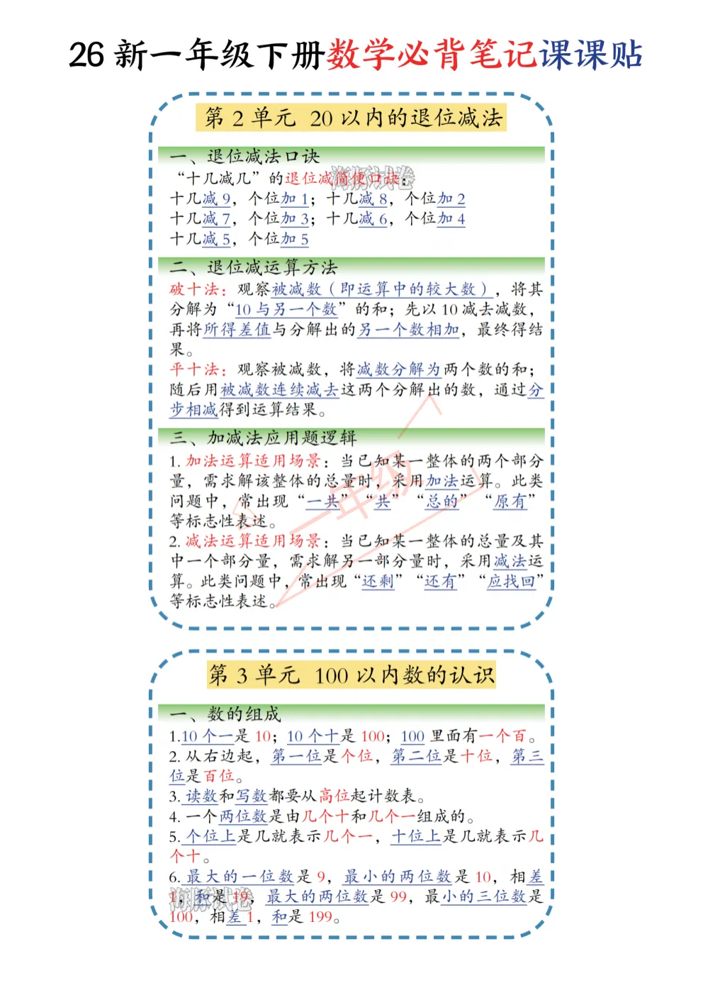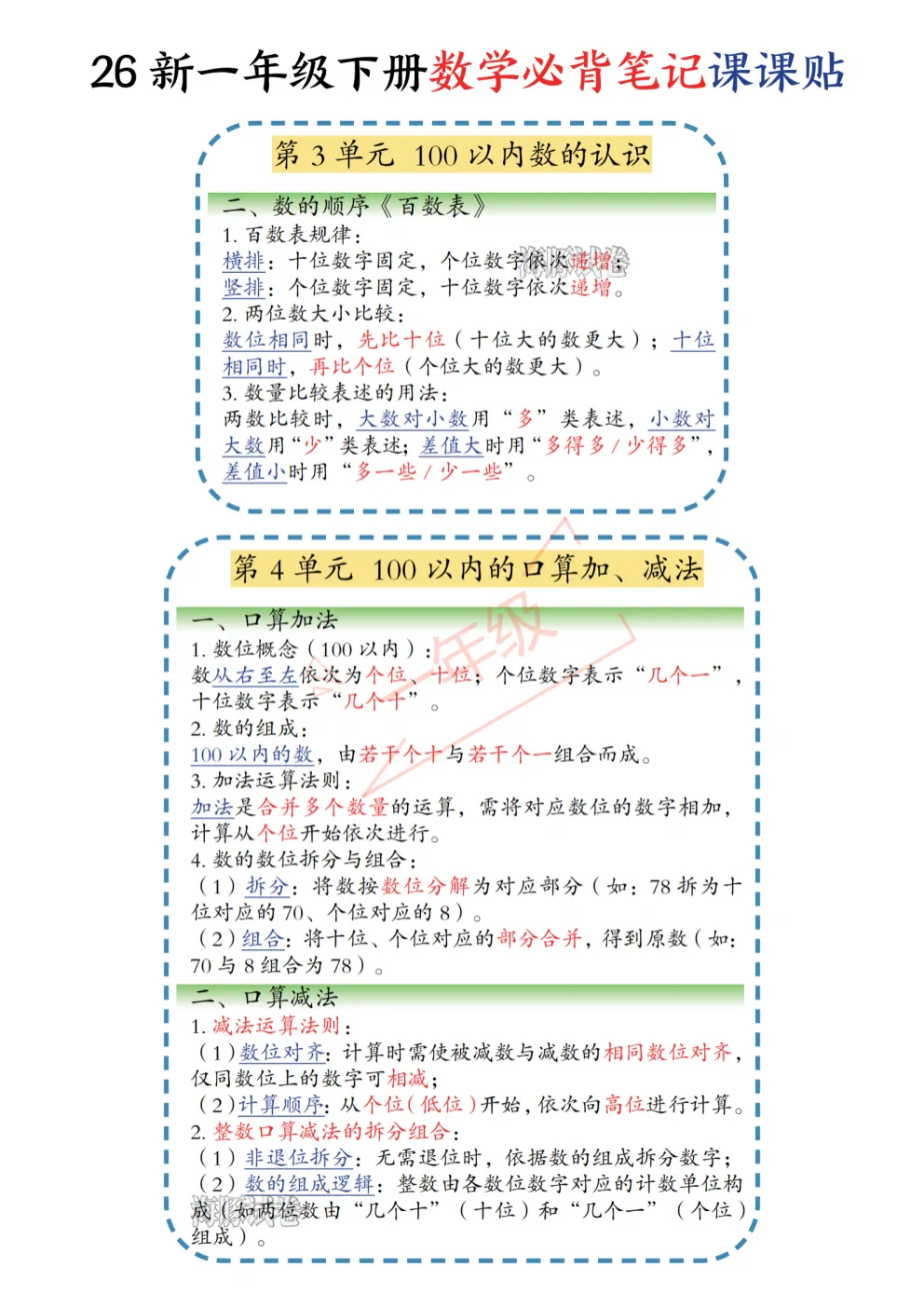 26年春最新版‖一年级下册数学《重要考点课课贴(晨读晚默)》,数学重点课堂笔记+重点归纳,可打印