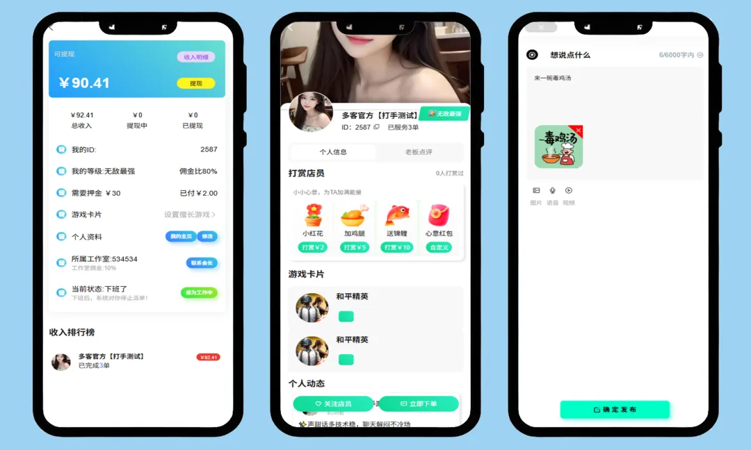 :下单(选择游戏、段位、服务类型)、订单支付、进度查询、评价反馈。 代练端