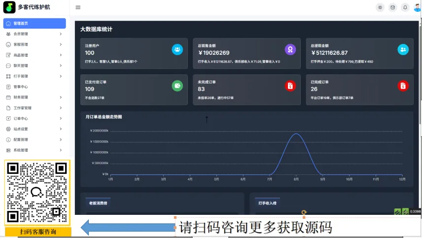 :提供数据大屏,实时监控订单量、交易额、活跃代练者等核心指标,帮助运营者掌握经营状况。