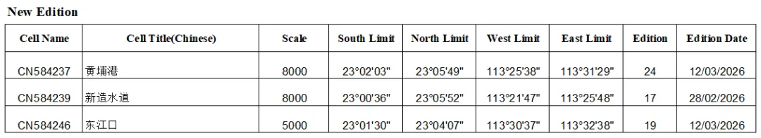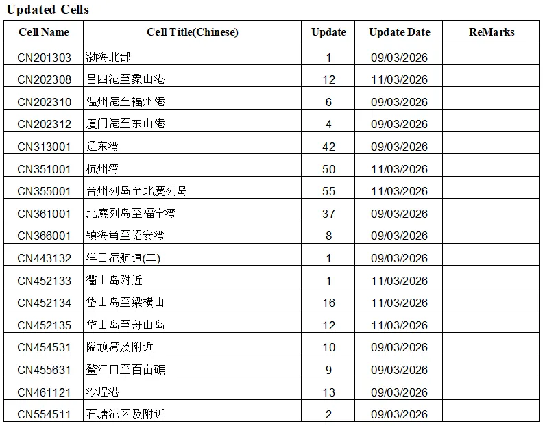 海事局电子海图数据更新说明 CN_WK11-26 海事版现已出版官方电子海图 553 幅,覆盖全国沿海所有航线和港口航道。官方电子海图每周更新一次。更新包括所有最新的改正通告内容和改版,新版电子海图。 舟山海图信息科技有限公司具有交通运输部东海航海保障中心上海海图中心一级代理授权,为用户每周提供最新的官方电子海图数据更新服务。 欢迎来电咨询,热线电话 18805800011 WK11-2026 数据更新列表