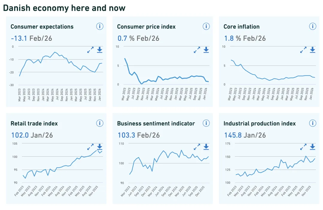 丹麦统计局最近刚公布的数据,我大概翻了翻,用大白话讲给大家听:2025年第四季度GDP环比涨了0.2%,不算多,但稳;2026年2月的通胀只有0.7%,不用担心钱不值钱;2026年1月的失业率大概3.0%,大部分人都能有稳定的工作。OECD也提了一嘴,丹麦的劳动力市场和公共财政还是很扎实,就是未来几年经济增速会慢一点,不用指望它突然爆发,但底盘够稳,抗造。