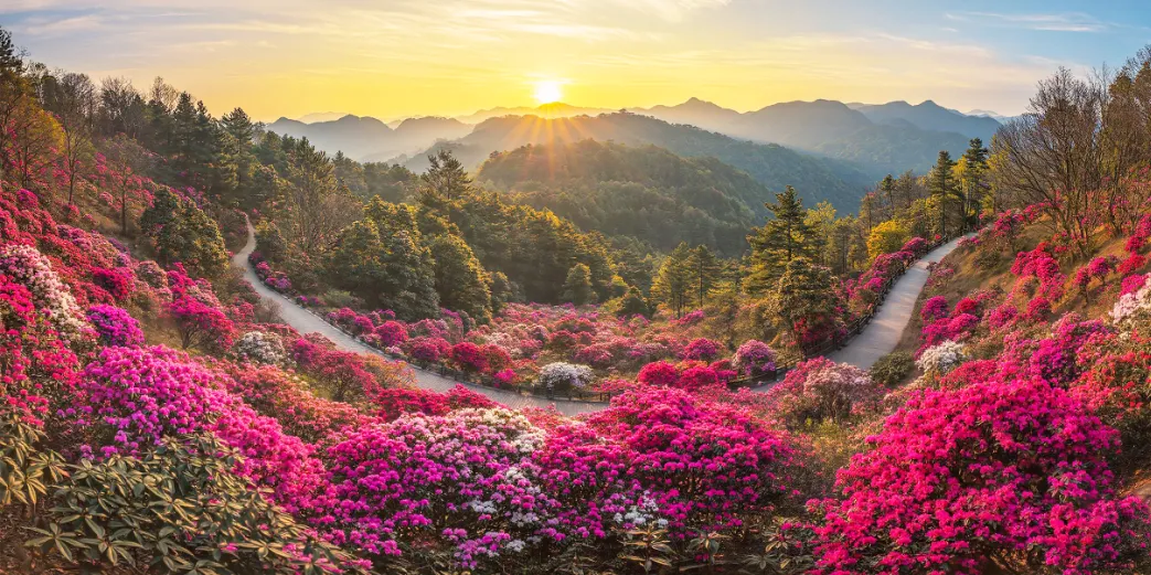 此时正值盛花期,50公里花海漫山遍野,40余种杜鹃花竞相开放。