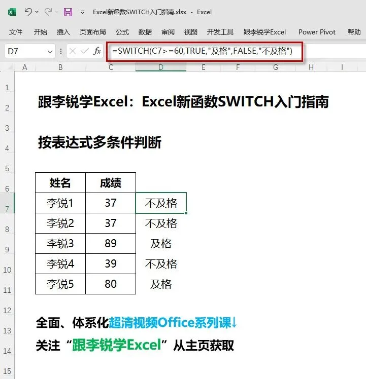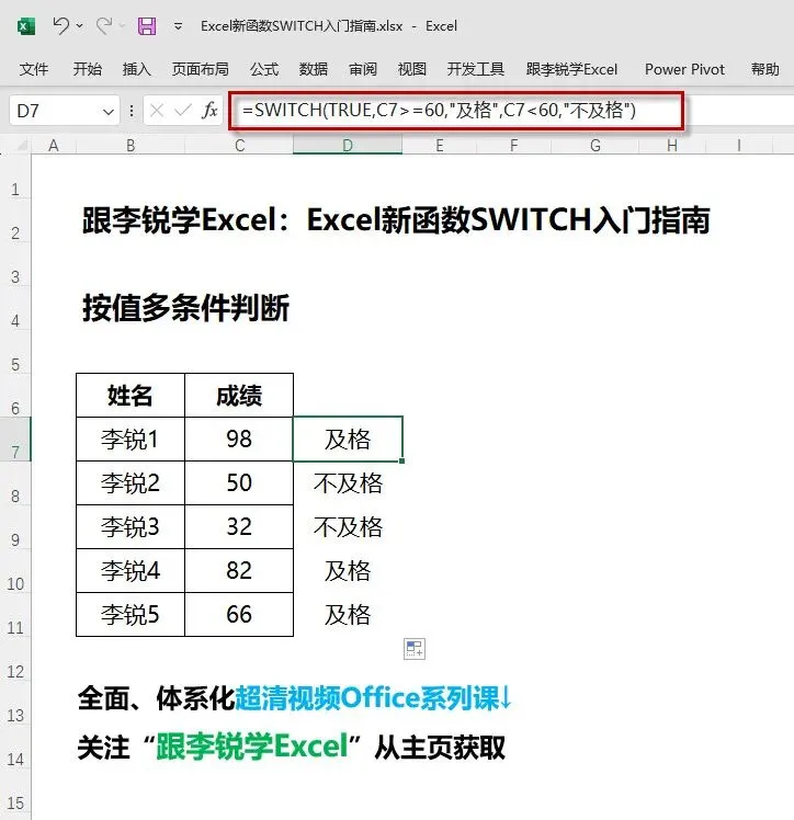 =SWITCH(TRUE,C7>=60,”及格”,C7<60,”不及格”)