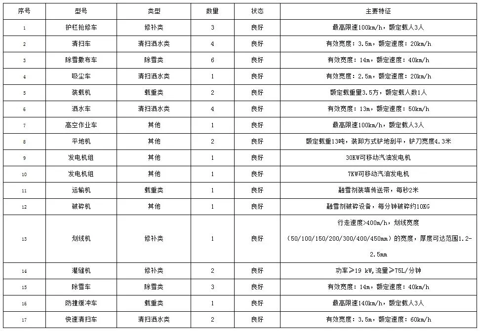 公司拥有多种闲置设备,如护栏抢修车、清扫车、除雪撒布车、洒水车、吸尘车、装载机等,涵盖修补、清扫洒水、除雪、载重等多种类型,状态良好,具备不同工作性能和参数,可满足多种道路养护及相关作业需求。闲置设备资源情况如下: