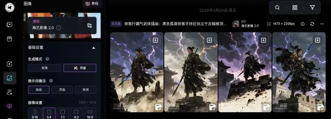提示词:侠客行霸气武侠插画:黑衣孤高侠客手持巨剑立于古城楼顶,身披黑金披风,面容冷峻气场全开,身后电闪雷鸣、乌云压城,长刀出鞘寒光凛冽,地面飞沙走石,整体构图张力拉满,光影强烈,充满江湖肃杀与王者霸气。